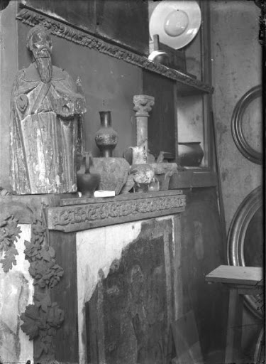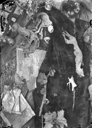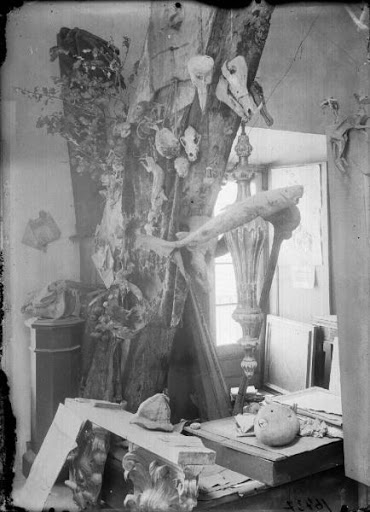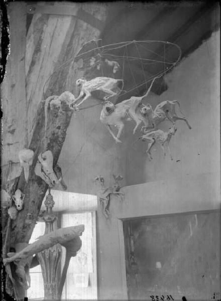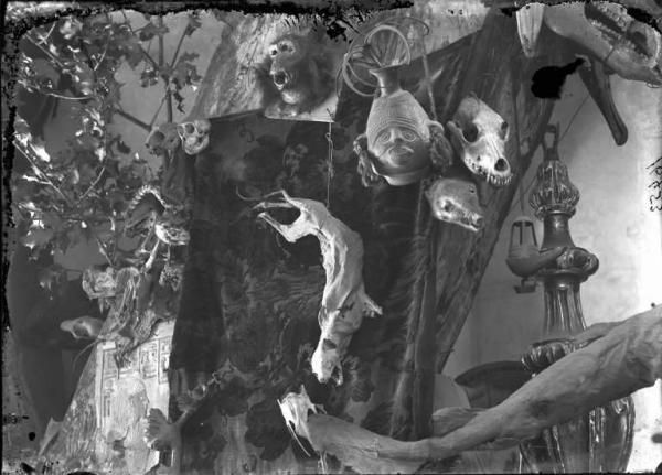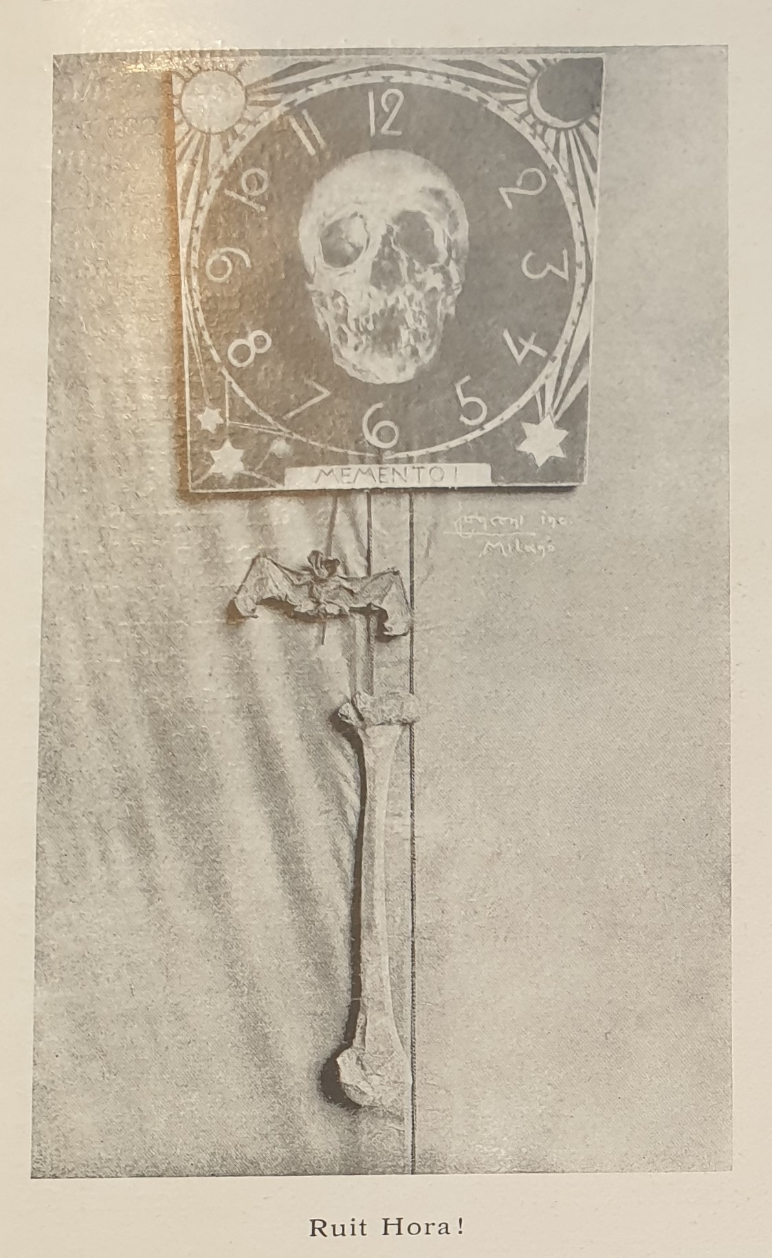 Dal soffitto pendono pipistrelli morti polverosi e secchi; sui muri, sugli stipiti delle porte si disegnano paurose e ghignanti le mummie di gatti e di puzzole disseccate sui tetti; lungo le pareti, su tavoli pelli di lucertola, ramarri, sorci, rane, insieme a teschi funebremente bianchi, civettoni, gufi e negli angoli i più strani ghiribizzi che mania di collettore abbia potuto accumulare nelle ricerche delle tombe etrusche e negli scavi preistorici … Un orologio col quadrante dipinto a teschi e coi pesi a foggia di osso di morto e di mummia di pipistrello è stato poi riprodotto in una delle sue acqueforti