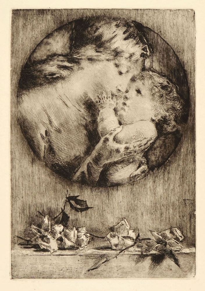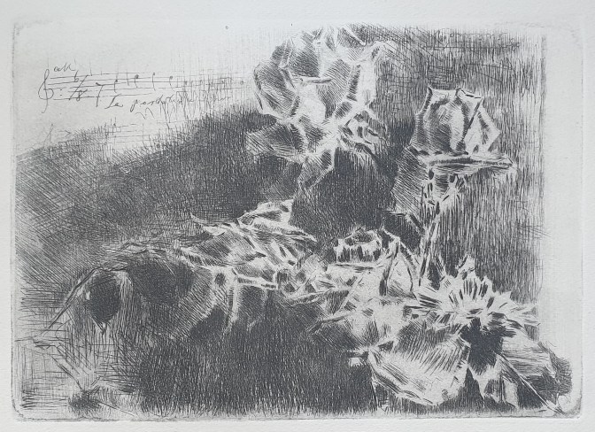 Proprio di un anno precedente all’Esposizione Nazionale è la mia acquaforte, come risulta inciso in alto a sinistra insieme alla firma. E’ conosciuta con nomi diversi: Le parlate d’amor, oppure Rose, oppure ancora Gruppo di rose con note musicali e si ispira all’atto III del Faust di Gounod, andato in scena al Teatro alla Scala nel 1880. Nell’incisione sono riportate alcune note dell’opera e del testo: Siebel, innamorato di Margherita e rivale di Faust, si rivolge ai fiori in un giardino di rose: Le parlate d’amor – o cari fiori – ditele che l’adoro – che il solo mio tesor – ditele che il mio cuor – langue d’amor! Nell’acquaforte le rose alludono quindi sia all’ambientazione della scena sia al messaggio d’amore per Margherita; la scelta del soggetto si colloca perfettamente nello spirito della Scapigliatura, alla ricerca di sinergie fra tutte le arti espressive, la parola, il suono, l’immagine.