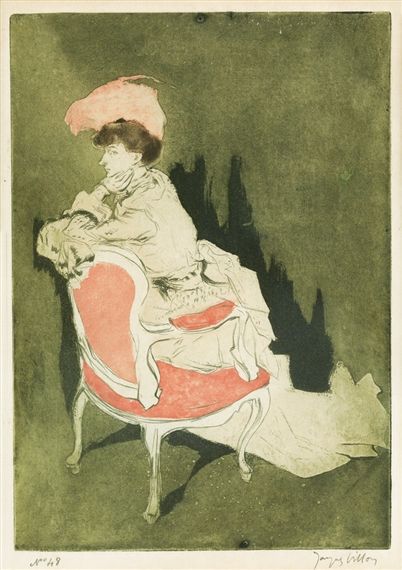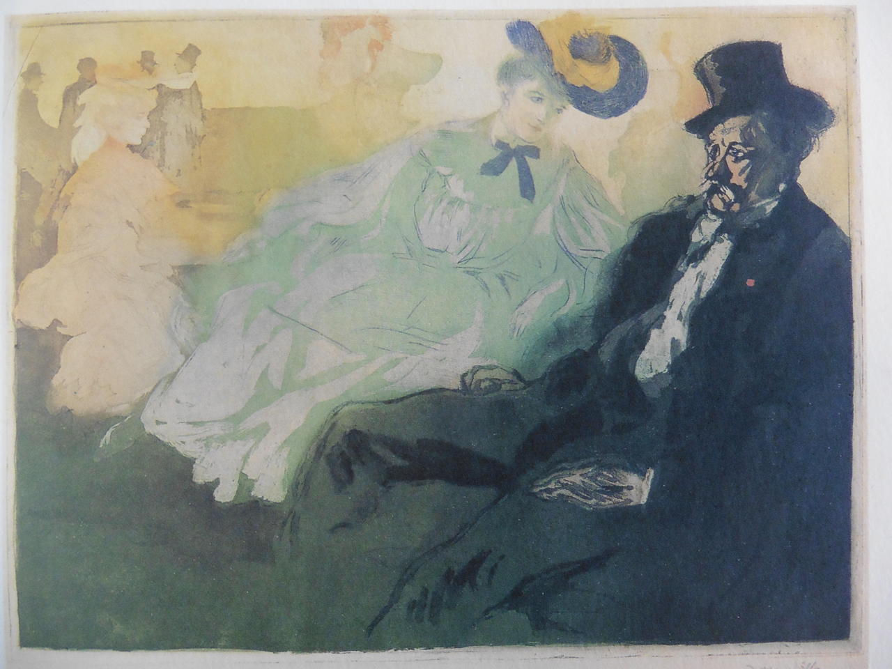 Torniamo al maggiore, Jacques Villon, e al suo prima, la sua attività come disegnatore, illustratore, incisore negli anni che vanno dal 1895 al 1912, anni che in seguito però non ricorderà con piacere, pur avendo collaborato con tutte le maggiori testate parigine: Le Rire, Le chat noir, La Revue parisienne, Courrier Francais. Nella maturità dirà di aver perso troppo tempo dietro alle riviste, di aver passato 15 anni instradato in una via senza uscita. Ma che fosse un disegnatore eccezionale lo conferma l’episodio raccontato dallo storico dell’arte Jean Adhemar, secondo il quale il direttore del Courrier Francais, dopo aver visto un paio di suoi bozzetti, lo avrebbe mandato a prendere con la sua carrozza personale pur di poterlo immediatamente assoldare come disegnatore della sua testata: quando questo succedeva Villon aveva solo 22 anni. Contemporaneamente ai suoi impegni per i giornali riuscirà comunque a dedicarsi all’incisione, la sua vera passione, che coltiverà tutta la vita con esiti straordinari. Le sue acquetinte a colori di questo periodo – stampate e pubblicate dal celebre e rodato duo Delâtre/Sagot, e che ricordano nel tratto e nell’atmosfera bohémien le incisioni di Toulouse-Lautrec – sono bellissime e molto ricercate dai collezionisti; Jean Adhemar, che ha curato una pubblicazione sulla sua opera grafica nel 1959, ha giustamente sottolineato che Villon ha saputo fare dell’incisione a colori, che era spesso assai volgare, un’espressione raffinata ed elegante.