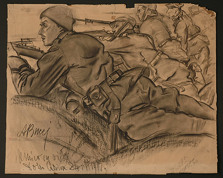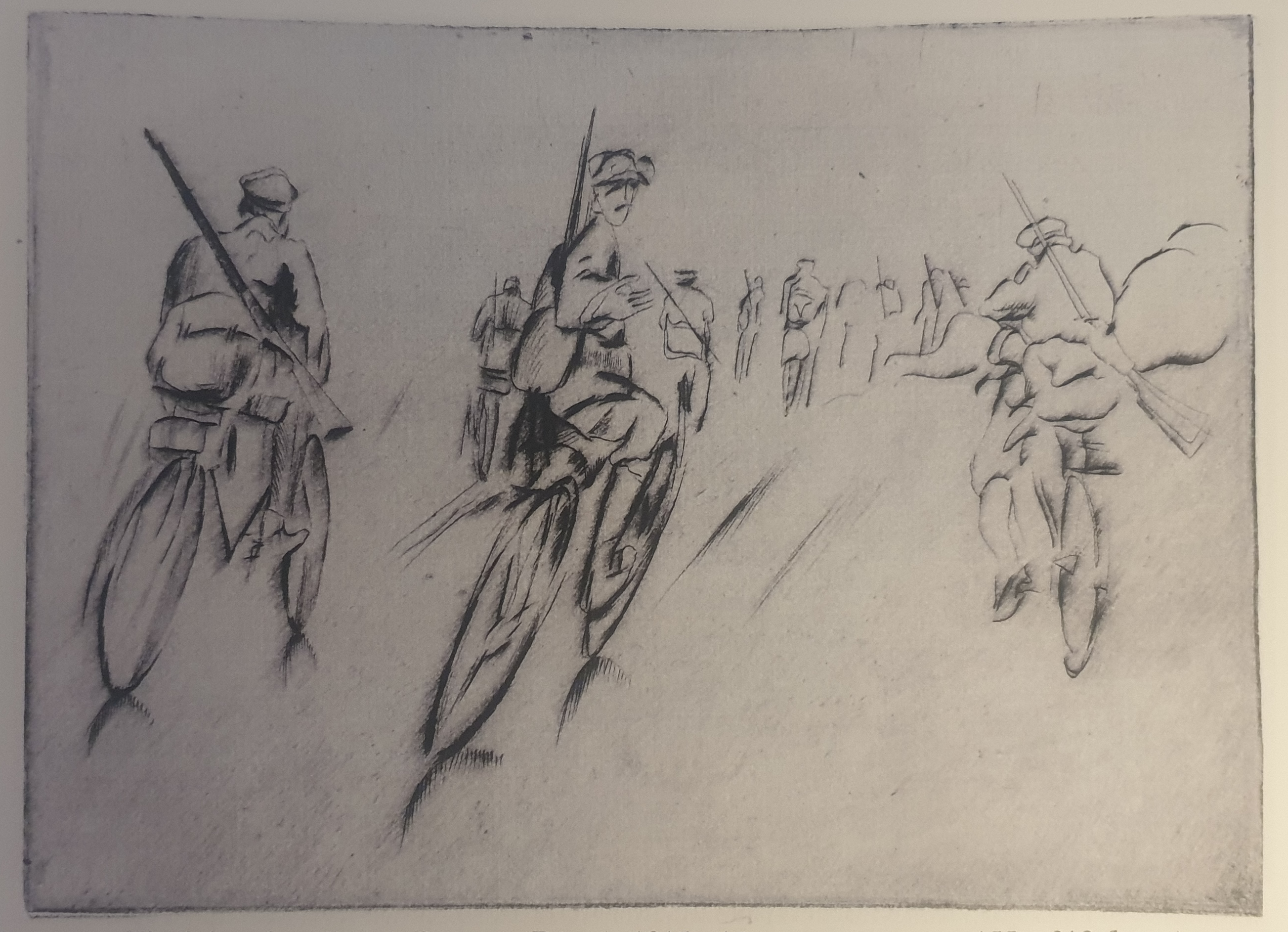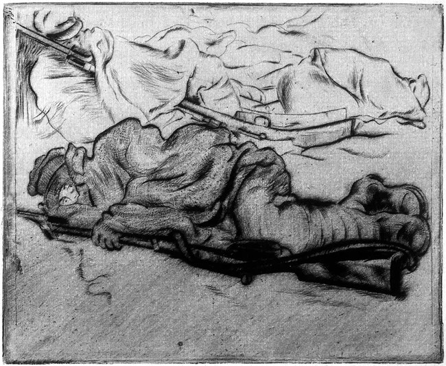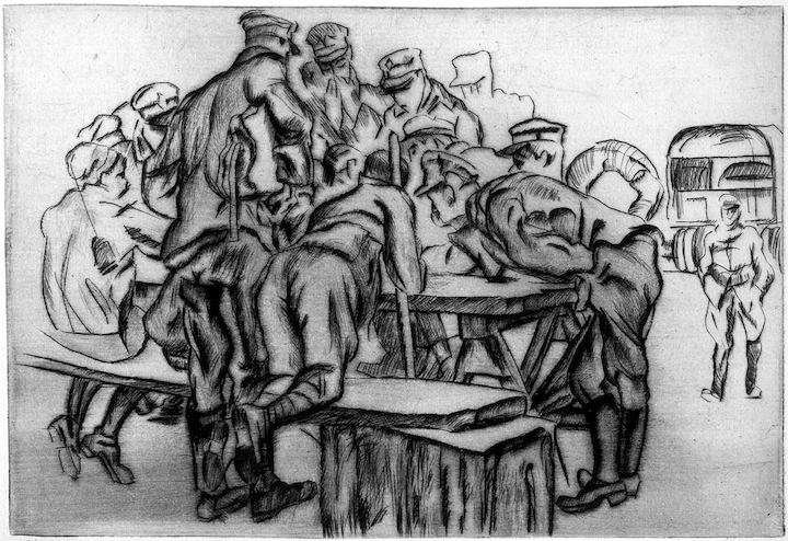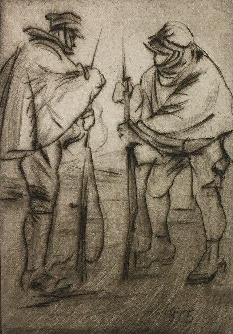La maggioranza si trova sul campo di battaglia senza averlo scelto, alcuni invece (pochi) si arruolano addirittura volontariamente. E’ questo il caso di Anselmo Bucci (1877/1955), autore di questa piccola incisione (En tranchée ouverte) che fa parte della serie di 50 puntesecche dei Croquis du front italien del 1917, serie interamente ispirata e realizzata nei suoi primi due anni in guerra, considerata una delle più fresche ed efficaci cronache per immagini pervenutaci dal fronte, benché non l’unica. A questo proposito è interessante navigare in questo sito, www.artegrandeguerra.it, dove sono stati riuniti con un paziente lavoro di raccolta disegni e schizzi di numerosi altri artisti, non solo italiani.