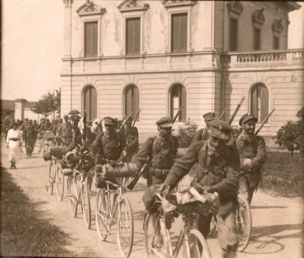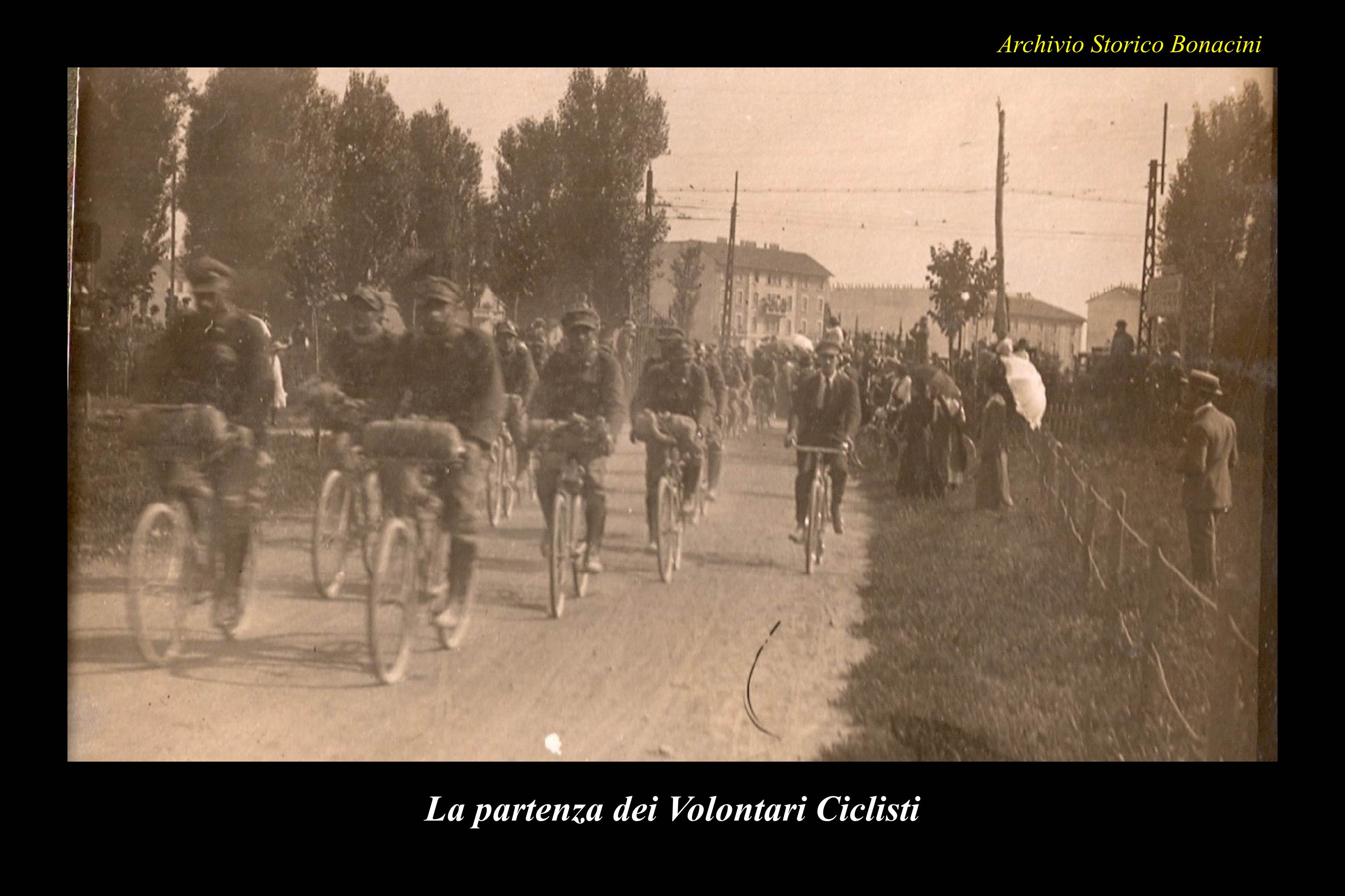 Le vicende di questo anomalo Battaglione meritano due parole in più: unico corpo formato da milizie volontarie, composto da circa 500 uomini, era nato come arma specializzata per la ricognizione e difesa territoriale in zone non montane. Diverso però fu il suo utilizzo e breve anche la sua esistenza. E’ commovente vedere le foto della partenza trionfale dei Volontari Lombardi da Milano il 24 maggio 1915: un manipolo di giovani entusiasti, felici di immolarsi per la causa, che equipaggiati alla bell’e meglio e inforcando i propri mezzi (bici rigorosamente di proprietà personale portate da casa!), da piazzale Loreto si dirigevano su una strada sterrata e polverosa verso l’ex Polveriera Ronchi a Peschiera del Garda, incoraggiati dal saluto festante della folla e forse dalla propria incosciente ingenuità.
