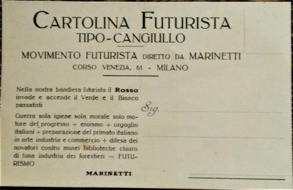 Nota di colore: pare che l’unico artista fra i Futuristi ad essere critico nei confronti del Battaglione Volontari sia stato Carrà, che in una lettera a Soffici scriveva: Questo corpo, m’ingannerò, ma a me pare una BURLA!(…). A me pare che chi vuole combattere sul serio, cioè fare a fucilate con gli austriaci, e ne ha le possibilità fisiche, dovrebbe arruolarsi e domandare di essere inquadrato nell’esercito regolare. Marinetti era ovviamente di tutt’altro avviso: si racconta che impossibilitato a partire con il suo gruppo per un’ernia improvvisa, pur di arruolarsi decideva di farsi operare in tutta fretta, raggiungendo gli amici a Peschiera dopo una cortissima degenza.