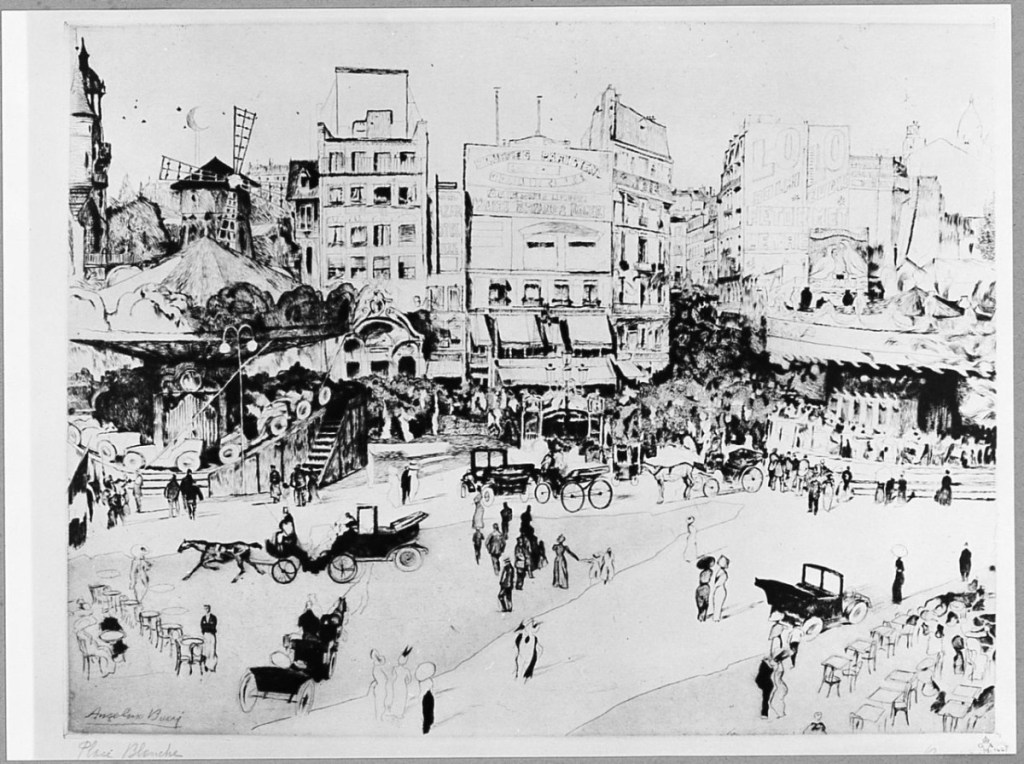 Facciamo un passo indietro: quando nel 1915 l’Italia decideva di entrare in guerra, Anselmo Bucci si trovava a Parigi, dove si era trasferito fin dal 1906, giovane artista impaziente di formarsi e aggiornarsi nella pittura. Lì aveva conosciuto e frequentato alcuni artisti d’avanguardia: Modigliani, Severini, Picasso, Utrillo; aveva appreso le tecniche incisorie da un maestro come Manuel Robbe ed era stato incoraggiato da Apollinaire e da un virtuoso dell’incisione come Louis Legrand (qui), riuscendo anche a pubblicare una serie di puntesecche su Parigi (Paris qui bouge) di buon successo. Era all’inizio della sua carriera.