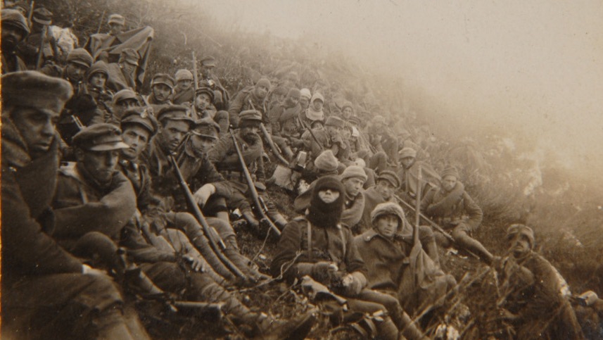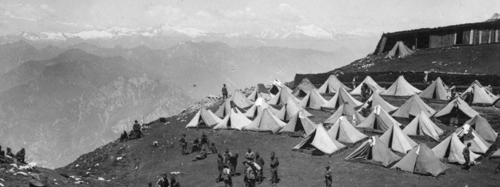 Finalmente a settembre i volontari del Battaglione vennero spostati a Malcesine e da lì, anche se su un terreno di guerra non in linea con la loro preparazione di forze ciclistiche, vennero impiegati come fanteria di montagna sul fronte del Monte Altissimo, che allora non era il confine tra il Veneto e il Trentino, come oggi, ma il confine tra Italia e Austria. Avevano desiderato l’adrenalina dello scontro, il faccia a faccia con il nemico. Iniziò anche per loro il freddo della vita in trincea e la pioggia degli shrapnel austriaci. E’ interessante confrontare lo stile di una lettera di Marinetti e quello di una di Bucci, entrambe scritte nel mese di settembre/ottobre dal fronte in montagna: il primo non rinunciava neanche al fronte, descrivendo la situazione, alle sue parole in libertà; dopo essersi complimentato con l’amico Cangiullo per la geniale invenzione della Lettera futurista Tipo-Cangiullo (proprio chiamata così, una specie di lettera/cartolina che circolava come format, utilizzata dai Futuristi per le comunicazioni dal fronte), aggiungeva: Voglio riformare lo stile epistolare ora assolutamente passatista pedante lungo monotono carico ridicolo! Laconismo + segni aritmetici + varietà calligrafica espressiva = lettere futuriste. Nostra vita = energia + volontà + 1.000.000 pulci + (tenda alata poca paglia vento ladro = dormire scoperti sotto stelle – ricordi erotici + castità rotolarsi poi fermarsi su perno) – Austriaci + volontà di battersi = eroismo oscuro = morte lenta