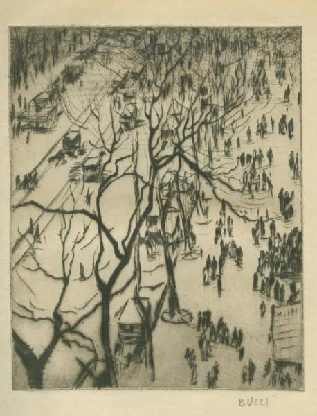 Le serie di incisioni e litografie da lui dedicate alla guerra e alla vita nell’esercito sono numerose: oltre ai Croquis del 1917, nel 1918 uscirono 50 litografie sulla Marina (Marina a terra), e la cartella Finis Austriae. Poi nel 1940 pubblicò un libro dedicato alla Marina Italiana e infine, nel 1941 uscì una serie di altre 24 puntesecche sulla guerra. Non dobbiamo pensare però che sia stato l’unico tema forte della sua carriera artistica, né che Bucci limitò la sua ricerca artistica alle tecniche incisorie, nelle quali comunque aveva dimostrato di eccellere. Anzi, con la maturità cercò di affrancarsi dall’incisione dedicandosi principalmente alla pittura: nel 1922 si distinse come uno dei fondatori del Gruppo Novecento (a lui si deve addirittura la scelta del nome). Espose con i maggiori esponenti del gruppo (Dudreville, Sironi, Funi, Oppi, Marussig, Malerba), anche se poi dissapori con Margherita Sarfatti lo allontanarono dal gruppo. Scrisse memorie (Il pittore volante, 1930; Il libro della Bigia, racconti, 1942; l’autobiografia Pane e Luna, pubblicata postuma nel 1977), collaborò con riviste e quotidiani, si occupò anche di illustrazione di libri e di arredamento (la decorazione dei saloni di tre piroscafi della Compagnia Navigazione Libera Triestina). Ma il suo spirito libero e una certa avversione a farsi definire in una determinata corrente artistica lo hanno posto ai margini della pittura figurativa italiana, forse immeritatamente.